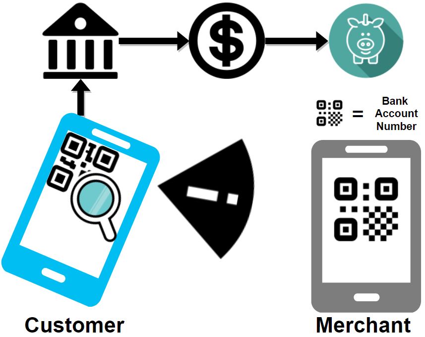 Above is a simple process flow diagram that shows how payment is done with QR code. Essentially, the QR code on the merchant's phone may represent the bank account number of the merchant or account ID of the merchant depending on how the app is set up to generate the QR code. When the customer scans the merchant's QR code with the app, it will be able to identify the account ID of the recipient to pay to. After the customer has input the amount and clicked "Send", a request will be sent to the backend for the money to be transferred from the customer's account to the merchant's account. There are many other ways of doing payment in the backend which I will not go into details here.